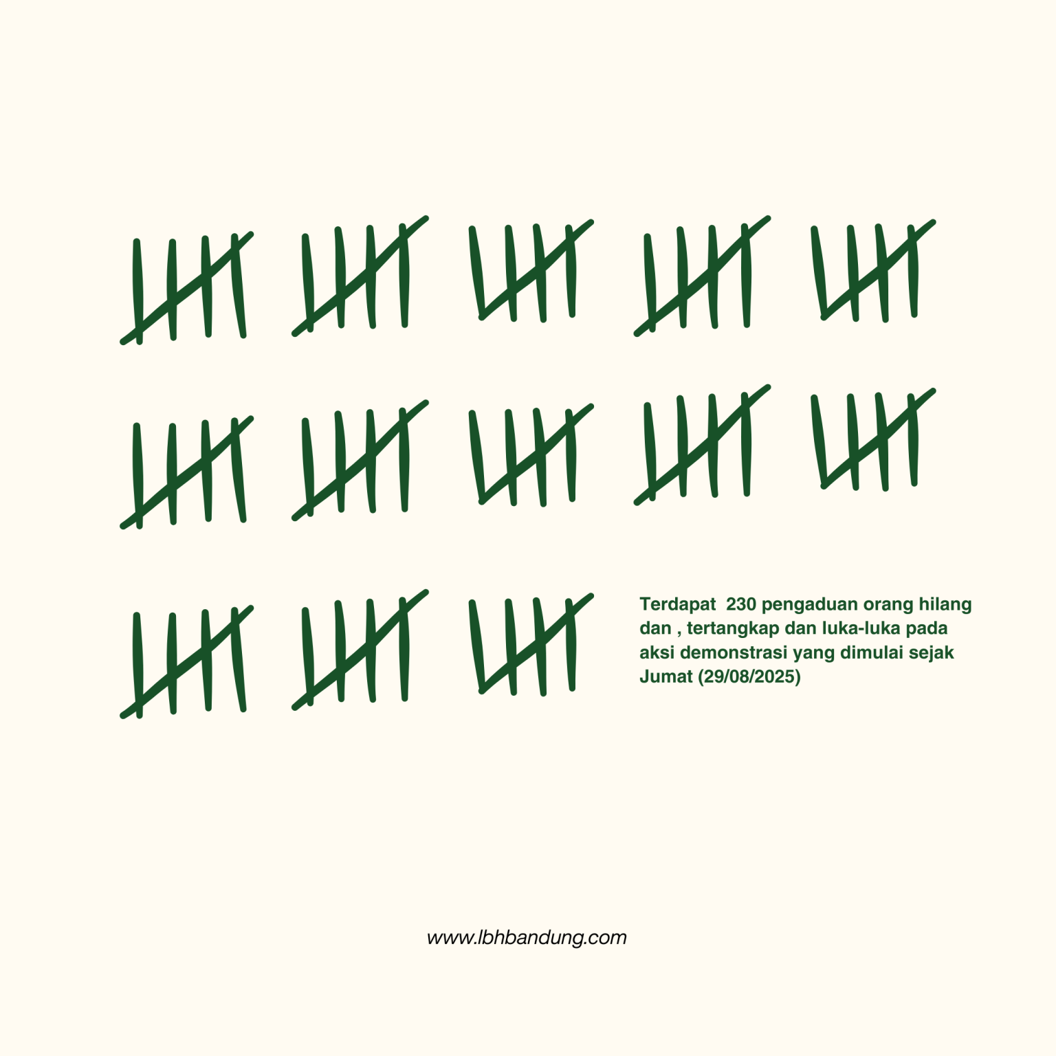 Dalam siaran pers yang dirilis Rabu (10/9), LBH Bandung menyebut telah menerima sedikitnya 230 laporan terkait orang hilang usai demonstrasi. Sejauh ini ada sekitar 100 orang dilaporkan sudah dibebaskan, 13 orang ditetapkan sebagai tersangka, 48 orang mengalami luka-luka, dan 69 orang lainnya masih belum diketahui statusnya.