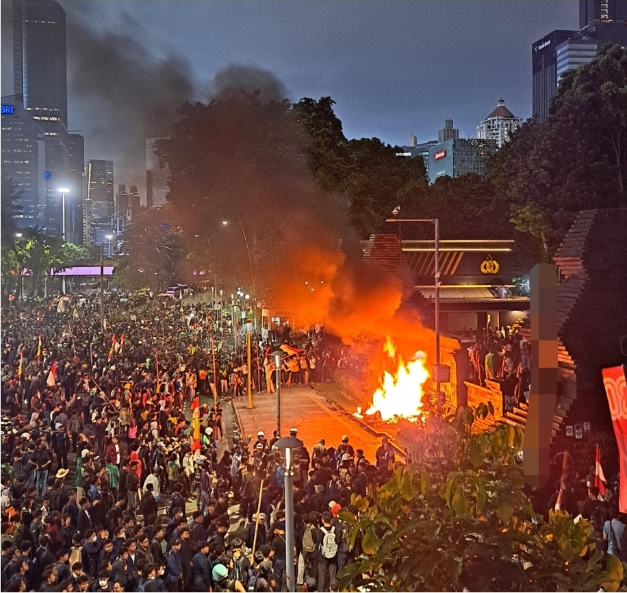 Kerusuhan pecah ketika massa yang bertahan di depan Polda Metro Jaya menghadapi upaya pembubaran paksa. Api membakar barikade, asap hitam membumbung ke langit malam, dan situasi kota mendadak berubah mencekam. Demonstrasi yang sebelumnya berfokus pada tuntutan terhadap DPR kini meluas menjadi desakan akuntabilitas penuh terhadap kepolisian.
