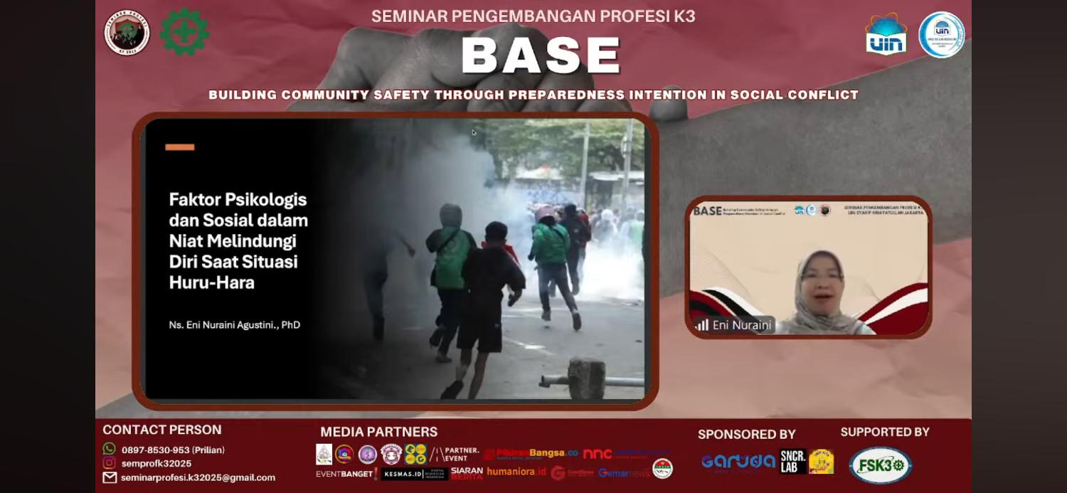 Pilihan-Rakyat.com, Jakarta – Mahasiswa Program Studi Kesehatan Masyarakat, peminatan Keselamatan dan Kesehatan Kerja (K3) dari UIN Syarif Hidayatullah Jakarta menggelar Webinar bertajuk “BASE: Building Community Safety through Preparedness Intention in Social Conflict”, sebagai upaya memperkuat kesadaran masyarakat terhadap pentingnya K3 tidak hanyadi lingkungan kerja, tetapi juga dalam kehidupan sosial.
