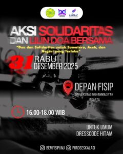 Dalam momentum pergantian tahun, Ketua BEM FISIP UMJ Alfian Maulana menyerukan kepada seluruh mahasiswa dan elemen masyarakat untuk menahan diri dari euforia perayaan tahun baru. Tahun ini menjadi tahun yang kelam dan penuh duka bagi bangsa Indonesia, khususnya bagi saudara-saudara kita di Sumatra dan daerah lainnya yang dilanda berbagai bencana alam. Seruan ini bukanlah bentuk penolakan terhadap kebahagiaan, melainkan wujud keyakinan bahwa empati adalah bentuk tertinggi dari kemanusiaan.